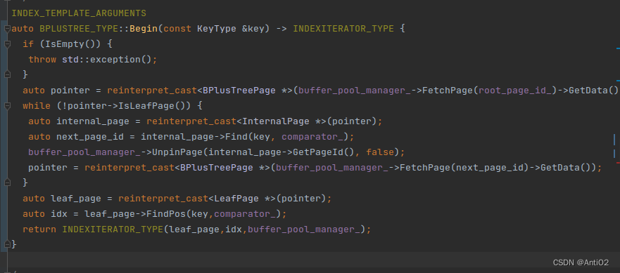 reinterpret_cast<BPlusTreePage *>(buffer_pool_manager_->FetchPage(page_id_)->GetData());来从buffer_pool中获取页 - 每次Find到想要的数据之后,记得Unpin