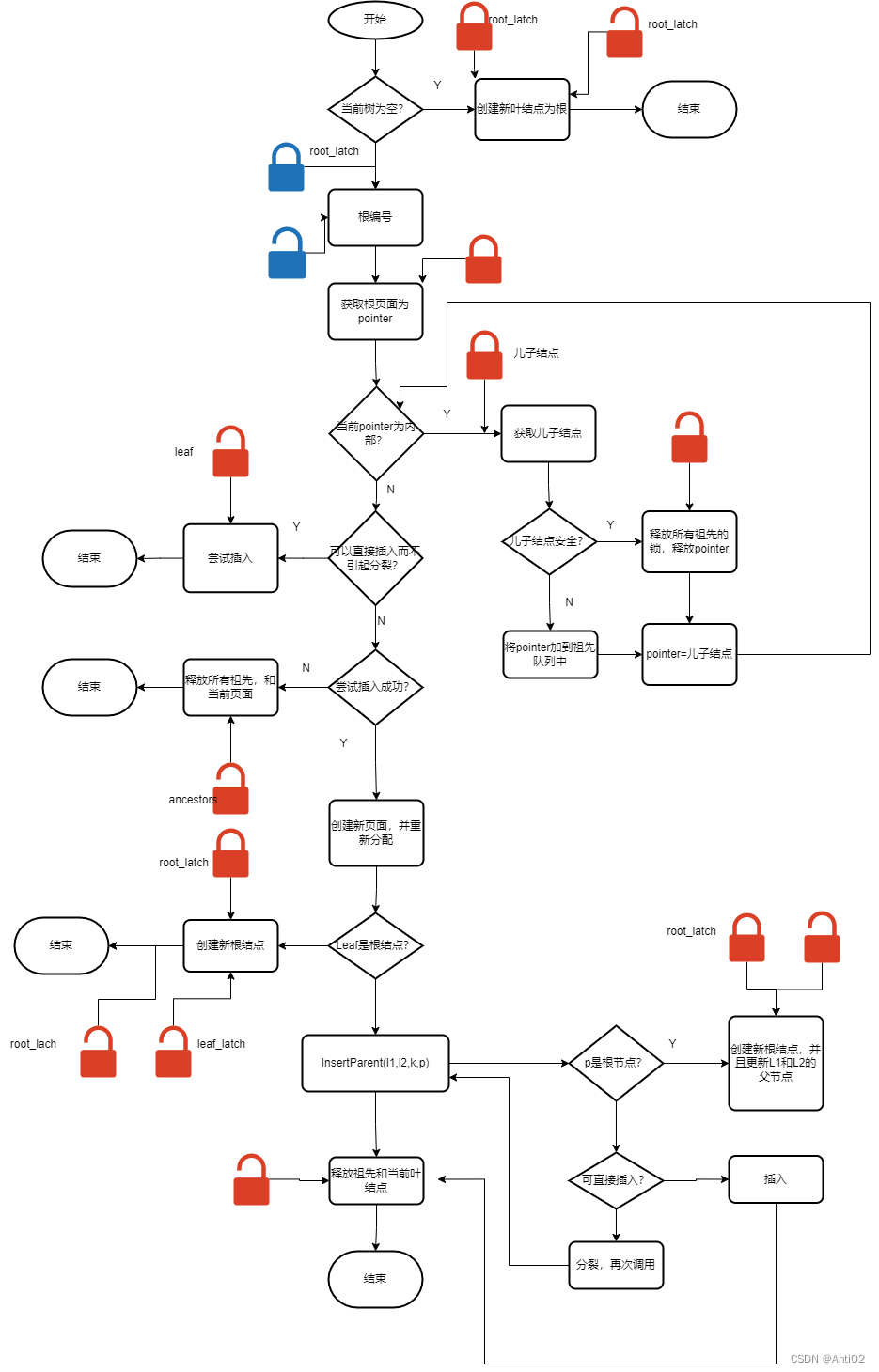 然后还有一点,如果你有死锁问题可能是其他帮助函数写错了,不要只死盯着insert和remove不放。 最后放一张我检查时画的流程图吧,蓝色是读锁,红色是写锁