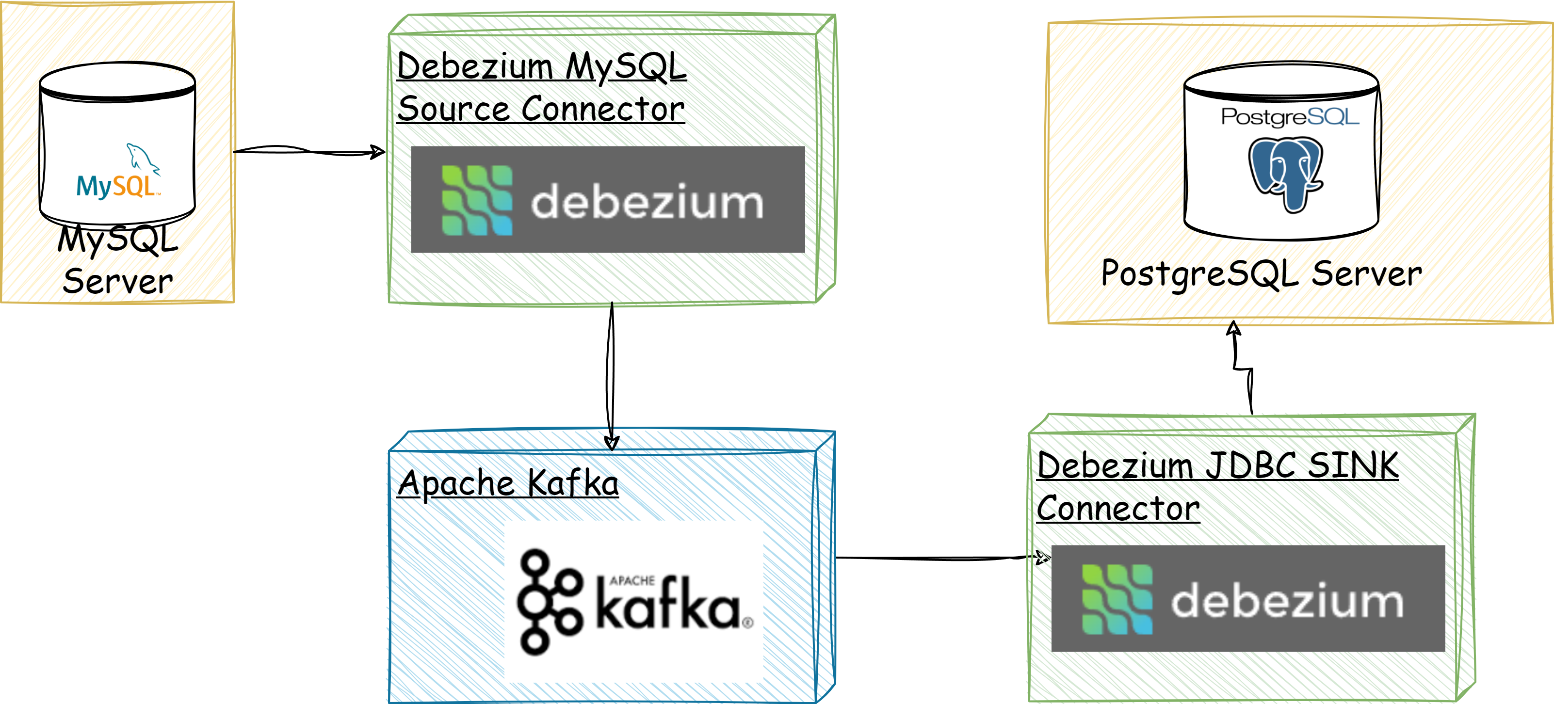 搭建从MySQL -> Debezium Source Connector -> Kafka -> Debezium JDBC Sink Connector -> PostgreSQL 的服务。架构如下