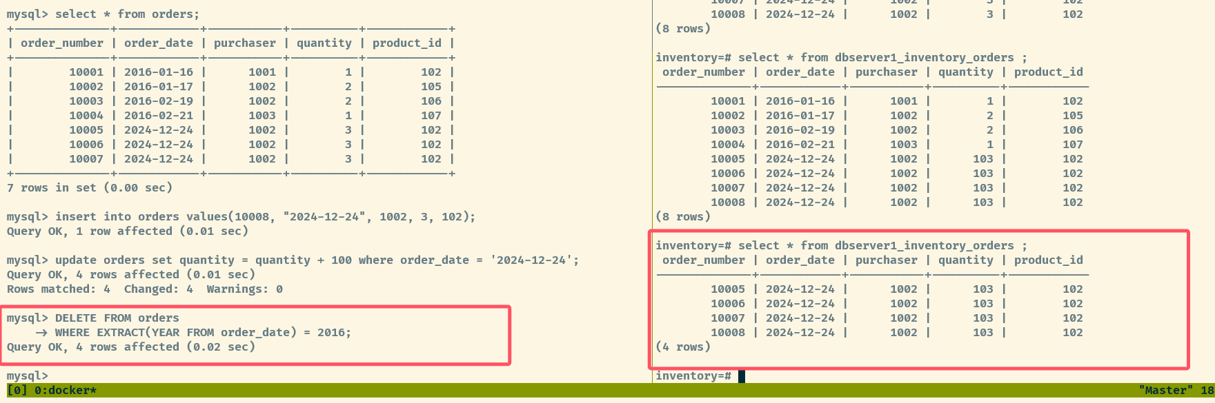 mysql中使用use inventory, psql输出\c inventory 切换到inventory数据库。可以看到mysql中已经有了示例数据,pg中有表dbserver1_inventory_orders。该表是在pg-jdbc-connector-orders 启动时被创建的,并且已经同步了已有的数据