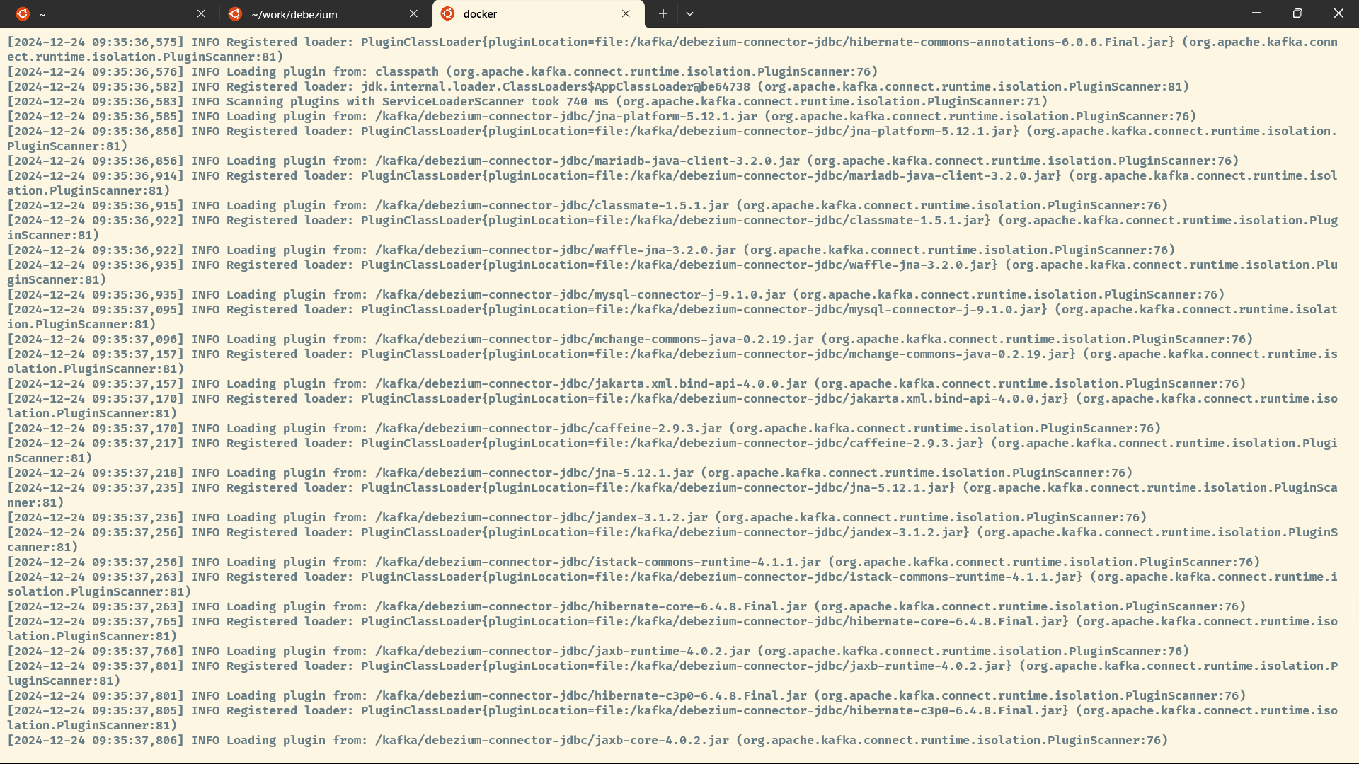 启动connector: bin/connect-standalone.sh config/connect-standalone.properties启动时应当可以看到加载debezium plugin的信息,并且没有报错