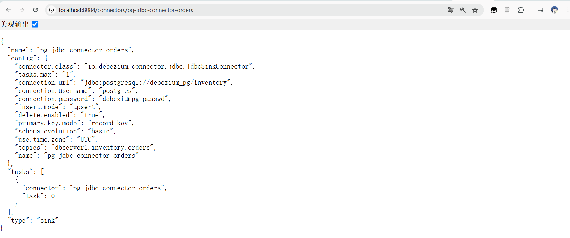 访问http://localhost:8084/connectors/pg-jdbc-connector-orders , 可以看到成功注册的sink_connector 信息
